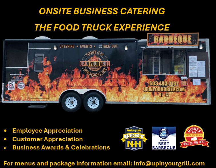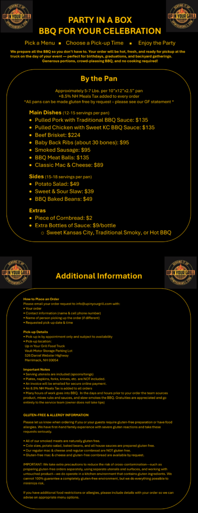 2) Party in a Box catering. We prepare all of our delicious BBQ for you and we’ll have it ready for pick-up at the truck on the day of your event. Pick-up location is at our homebase at 526 Daniel Webster Highway, Merrimack, NH.